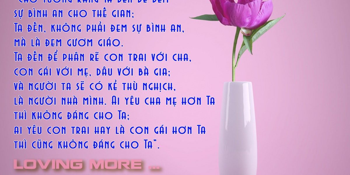 (Đức Chúa Giê-xu phán) “Chớ tưởng rằng ta đến để đem sự bình an cho thế gian; ta đến, không phải đem sự bình an, mà là đem gươm giáo. Ta đến để phân rẽ con trai với cha, con gái với mẹ, dâu với bà gia; và người ta sẽ có kẻ thù nghịch, là người nhà mình. Ai yêu cha mẹ hơn ta thì không đáng cho ta; ai yêu con trai hay là con gái hơn ta thì cũng không đáng cho ta”. (Ma-thi-ơ 10:34-37)