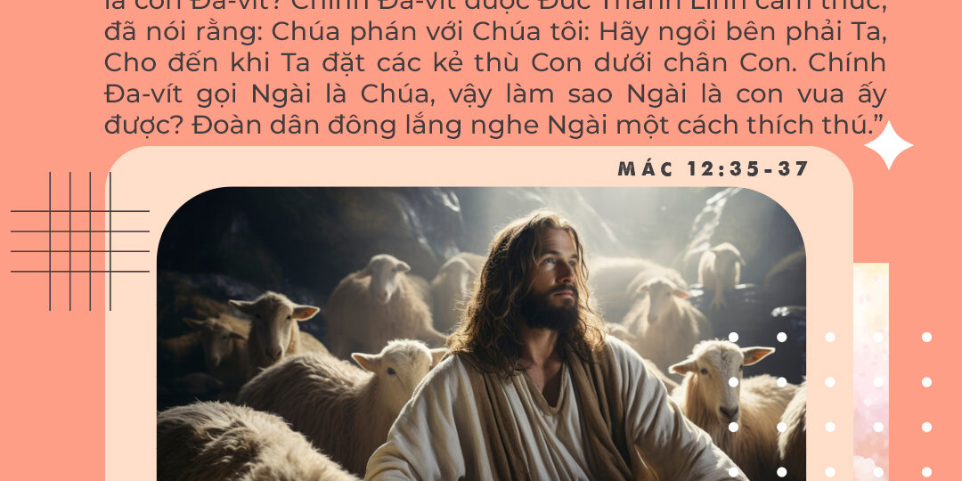 Kinh Thánh: “Khi đang giảng dạy trong đền thờ, Đức Chúa Jêsus đặt câu hỏi: Làm sao các thầy thông giáo lại có thể nói Đấng Christ là con Đa-vít? Chính Đa-vít được Đức Thánh Linh cảm thúc, đã nói rằng: Chúa phán với Chúa tôi: Hãy ngồi bên phải Ta, Cho đến khi Ta đặt các kẻ thù Con dưới chân Con. Chính Đa-vít gọi Ngài là Chúa, vậy làm sao Ngài là con vua ấy được? Đoàn dân đông lắng nghe Ngài một cách thích thú.” (Mác 12:35-37)