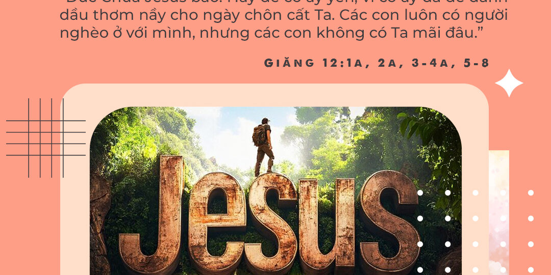 Kinh Thánh: “Sáu ngày trước lễ Vượt Qua, Đức Chúa Jêsus đến làng Bê-tha-ni … Họ dọn tiệc đãi Ngài tại đó… Ma-ri lấy một cân dầu cam tùng nguyên chất rất quý giá xức chân Đức Chúa Jêsus, rồi dùng tóc mình lau chân Ngài. Mùi dầu thơm tỏa khắp nhà. Nhưng … Giu-đa Ích-ca-ri-ốt… nói rằng: Sao không bán dầu thơm nầy lấy ba trăm đơ-ni-ê để cho người nghèo? Anh ta nói vậy không phải vì quan tâm đến người nghèo, nhưng vì vốn là một tên trộm cắp, lại giữ túi tiền, nên anh ta thường lấy trộm tiền mà người ta bỏ vào đó. Đức Chúa Jêsus bảo: Hãy để cô ấy yên, vì cô ấy đã để dành dầu thơm nầy cho ngày chôn cất Ta. Các con luôn có người nghèo ở với mình, nhưng các con không có Ta mãi đâu.” (Giăng 12:1a, 2a, 3-4a, 5-8)