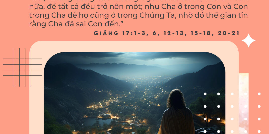 Kinh Thánh: [Đức Chúa Jêsus thưa rằng] “Cha ơi! Giờ đã đến, xin tôn vinh Con, để Con cũng tôn vinh Cha. Vì Cha đã ban cho Con thẩm quyền trên mọi loài xác thịt, để ban sự sống đời đời cho tất cả những người Cha ban cho Con. Sự sống đời đời là nhận biết Cha là Đức Chúa Trời duy nhất và chân thật, cùng Đức Chúa Jêsus Christ là Đấng Cha đã sai đến. Con đã bày tỏ danh Cha cho những người Cha ban cho Con từ giữa thế gian nầy… Con đã gìn giữ họ… Nhưng bây giờ Con về với Cha… xin Cha gìn giữ họ khỏi điều ác. Họ không thuộc về thế gian cũng như Con không thuộc về thế gian. Xin Cha dùng chân lý thánh hóa họ. Lời của Cha là chân lý. Như Cha đã sai Con vào thế gian thì Con cũng sai họ vào thế gian. Cha ơi! Con không chỉ cầu xin cho những người nầy mà thôi, nhưng cũng cho những người nhờ lời họ mà tin Con nữa, để tất cả đều trở nên một; như Cha ở trong Con và Con trong Cha để họ cũng ở trong Chúng Ta, nhờ đó thế gian tin rằng Cha đã sai Con đến.” (Giăng 17:1-3, 6, 12-13, 15-18, 20-21)