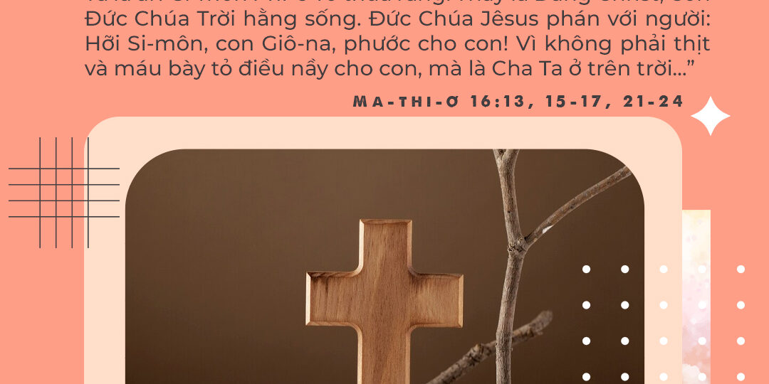 Kinh Thánh: “Đức Chúa Jêsus hỏi các môn đồ rằng… Còn các con thì nói Ta là ai? Si-môn Phi-e-rơ thưa rằng: Thầy là Đấng Christ, Con Đức Chúa Trời hằng sống. Đức Chúa Jêsus phán với người: Hỡi Si-môn, con Giô-na, phước cho con! Vì không phải thịt và máu bày tỏ điều nầy cho con, mà là Cha Ta ở trên trời… Từ lúc đó, Đức Chúa Jêsus bắt đầu bày tỏ cho các môn đồ biết rằng Ngài phải đi đến thành Giê-ru-sa-lem, phải chịu nhiều đau khổ bởi các trưởng lão, các thầy tế lễ cả cùng các thầy thông giáo, và phải bị giết, đến ngày thứ ba phải sống lại. Phi-e-rơ đem Ngài riêng ra và trách rằng: Lạy Chúa, Đức Chúa Trời nào nỡ vậy! Việc nầy sẽ không xảy đến cho Chúa đâu! Nhưng Ngài quay lại và phán với Phi-e-rơ: Hỡi Sa-tan, hãy lui ra đằng sau Ta! Ngươi là một chướng ngại cho Ta; vì ngươi chẳng nghĩ đến việc của Đức Chúa Trời, mà chỉ nghĩ đến việc của loài người. Rồi Đức Chúa Jêsus phán với các môn đồ rằng: Nếu ai muốn theo Ta thì phải từ bỏ chính mình, vác thập tự giá mình mà theo Ta.” (Ma-thi-ơ 16:13, 15-17, 21-24)