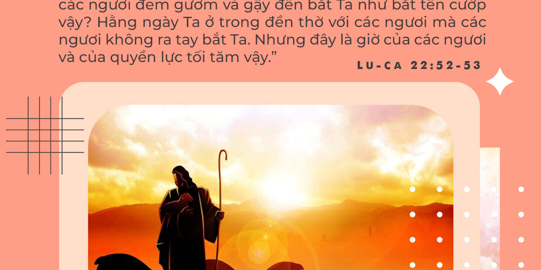 Kinh Thánh: “Đức Chúa Jêsus phán với các thầy tế lễ cả, các viên chức bảo vệ đền thờ và các trưởng lão đến bắt Ngài, rằng: Sao các ngươi đem gươm và gậy đến bắt Ta như bắt tên cướp vậy? Hằng ngày Ta ở trong đền thờ với các ngươi mà các ngươi không ra tay bắt Ta. Nhưng đây là giờ của các ngươi và của quyền lực tối tăm vậy.” (Lu-ca 22:52-53)