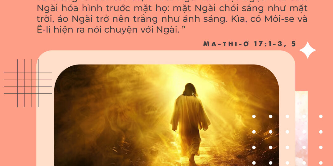 Kinh Thánh: “Sáu ngày sau, Đức Chúa Jêsus đem riêng Phi-e-rơ, Gia-cơ và Giăng là em Gia-cơ, đi với Ngài lên một ngọn núi cao. Ngài hóa hình trước mặt họ: mặt Ngài chói sáng như mặt trời, áo Ngài trở nên trắng như ánh sáng. Kìa, có Môi-se và Ê-li hiện ra nói chuyện với Ngài. …Lúc Phi-e-rơ còn đang nói, có một đám mây sáng rực che phủ họ; và từ trong mây có tiếng phán rằng: Đây là Con yêu dấu của Ta, đẹp lòng Ta hoàn toàn; hãy nghe lời Con ấy!” (Ma-thi-ơ 17:1-3, 5)