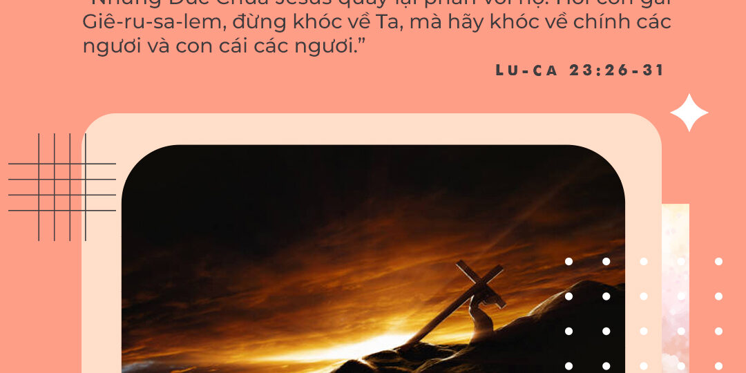Kinh Thánh: “Khi giải Đức Chúa Jêsus đi, họ bắt một người Sy-ren, tên Si-môn, từ miền quê lên, và buộc anh phải vác cây thập tự theo sau Ngài. Có đoàn dân rất đông đi theo Đức Chúa Jêsus và có nhiều phụ nữ đấm ngực than khóc Ngài. Nhưng Đức Chúa Jêsus quay lại phán với họ: Hỡi con gái Giê-ru-sa-lem, đừng khóc về Ta, mà hãy khóc về chính các ngươi và con cái các ngươi. Vì nầy, những ngày sắp đến, người ta sẽ nói: Phước cho đàn bà son sẻ, cho dạ không mang thai và vú không cho con bú! Rồi họ nói với núi: Hãy đổ xuống chúng tôi! và nói với đồi: Hãy che giấu chúng tôi! Vì nếu cây xanh mà người ta còn đối xử như thế thì cây khô sẽ ra sao?” (Lu-ca 23:26-31)