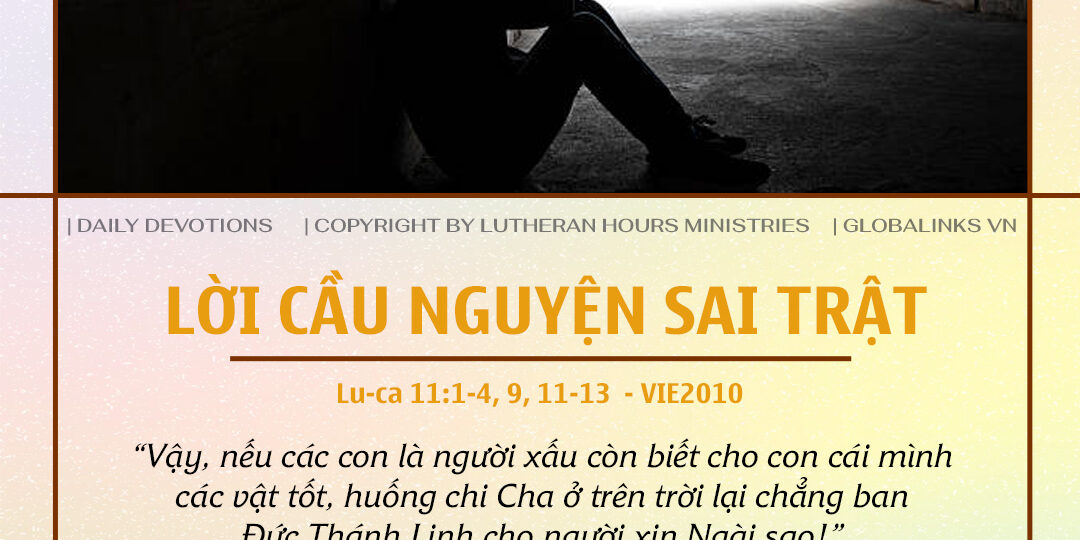 Kinh Thánh: “Đức Chúa Jêsus đang cầu nguyện ở một nơi kia. Khi cầu nguyện xong, một môn đồ thưa với Ngài: Lạy Chúa, xin dạy chúng con cầu nguyện, như Giăng đã dạy các môn đồ mình vậy. Ngài phán với họ: Khi các con cầu nguyện, hãy nói: Lạy Cha! Nguyện Danh Cha được tôn thánh. Vương quốc Cha được đến. Xin cho chúng con thức ăn ngày nào đủ cho ngày nấy. Xin tha tội cho chúng con, vì chúng con cũng tha kẻ mắc lỗi với chúng con. Xin đừng để chúng con sa vào sự cám dỗ! Vậy, Ta bảo các con: Hãy xin, sẽ được;… Trong các con có ai làm cha, khi con mình xin bánh mà cho đá chăng? Hay là xin cá mà cho rắn thay vì cá chăng? Hay là xin trứng mà cho bò cạp chăng? Vậy, nếu các con là người xấu còn biết cho con cái mình các vật tốt, huống chi Cha ở trên trời lại chẳng ban Đức Thánh Linh cho người xin Ngài sao!” (Lu-ca 11:1-4, 9, 11-13)