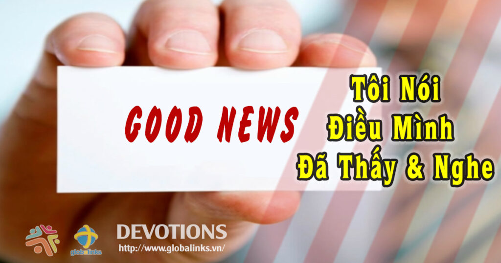 Bạn thân mến, đây chính trường hợp hiện tại của tôi: Tôi đã nhận được tin tức tốt lành! Tin mừng này sẽ trở thành sự cứu rỗi cho những ai tiếp nhận Chúa Giê-xu làm Cứu Chúa của mình. Nếu bạn đang còn lưỡng lự, tin tức tốt lành cho bạn ấy là Chúa sẽ dẫn bạn đến với Đấng Cứu Rỗi. Đây không phải là một sự ngẫu nhiên. Cũng phải không là sự tình cờ. Đức Thánh linh đang mời gọi bạn hôm nay. Đối với những ai đã nhận được tin mừng nơi Chúa, thì NAY chính là lúc bạn cần ra đi rao báo tin tức tốt lành này cho mọi người!
