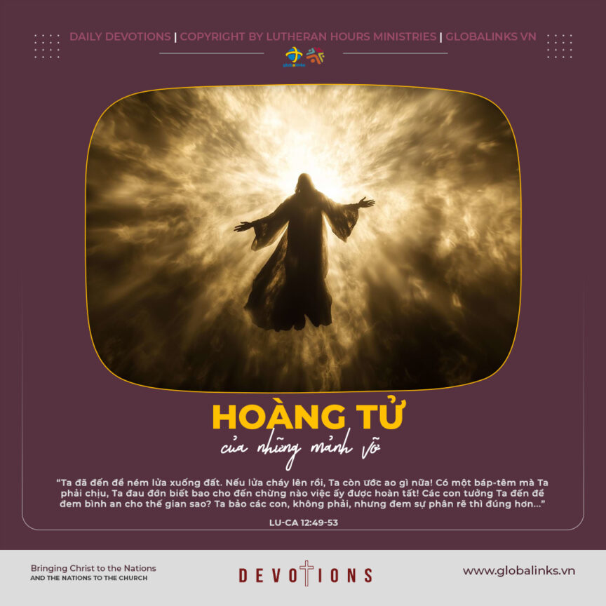 HOÀNG TỬ CỦA NHỮNG MẢNH VỠ Kinh Thánh: “Ta đã đến để ném lửa xuống đất. Nếu lửa cháy lên rồi, Ta còn ước ao gì nữa! Có một báp-têm mà Ta phải chịu, Ta đau đớn biết bao cho đến chừng nào việc ấy được hoàn tất! Các con tưởng Ta đến để đem…